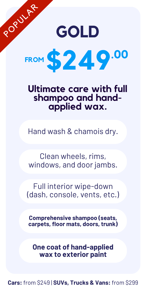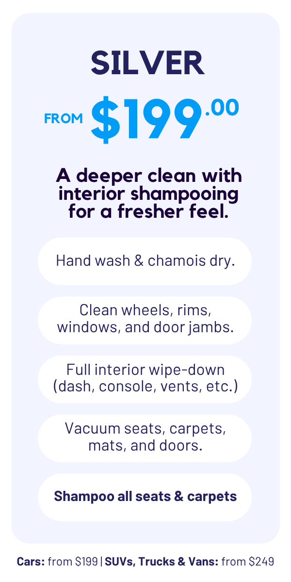 Choose from our Bronze, Silver, or Gold detailing packages - each designed to bring out the best in your vehicle, inside and out. Whether you're after a quick refresh or a deep clean, our professionally-trained team uses quality products and expert care to make your ride shine.