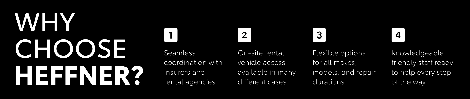 At Heffner Collision Centre, we understand that being without your vehicle can disrupt your daily routine. That’s why we offer convenient rental vehicle assistance to keep you on the road while your car is being repaired.